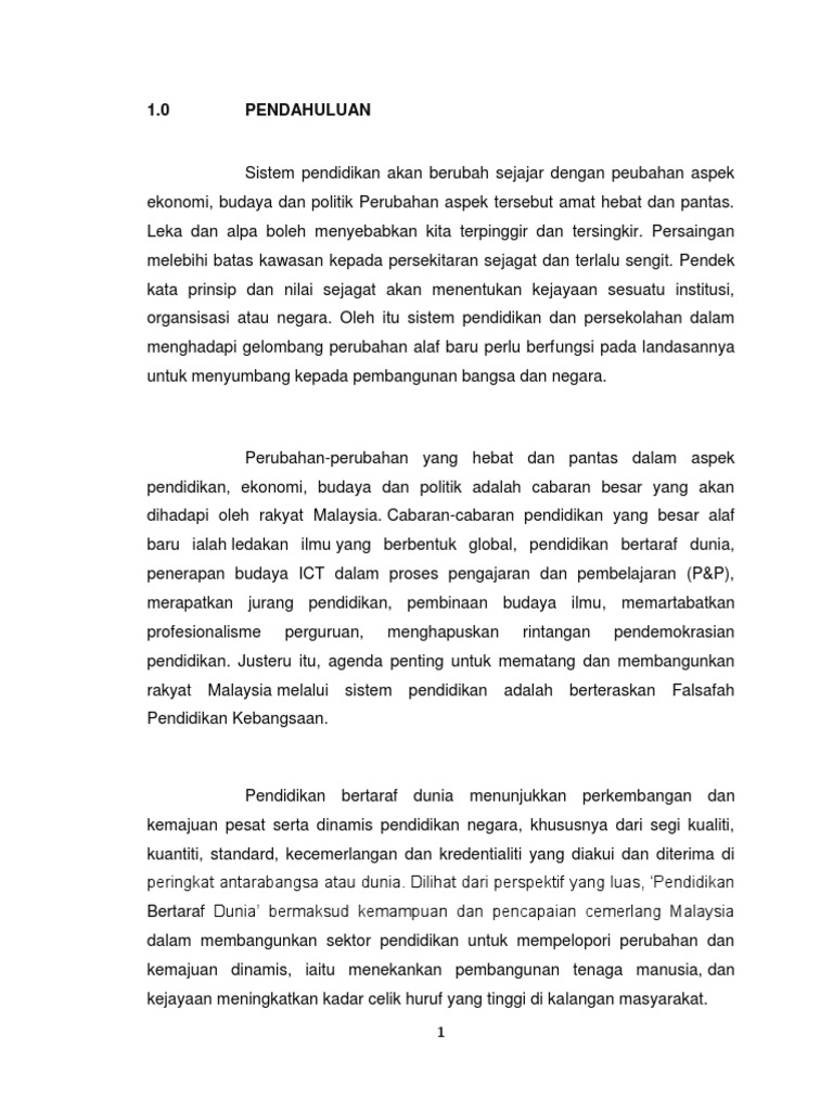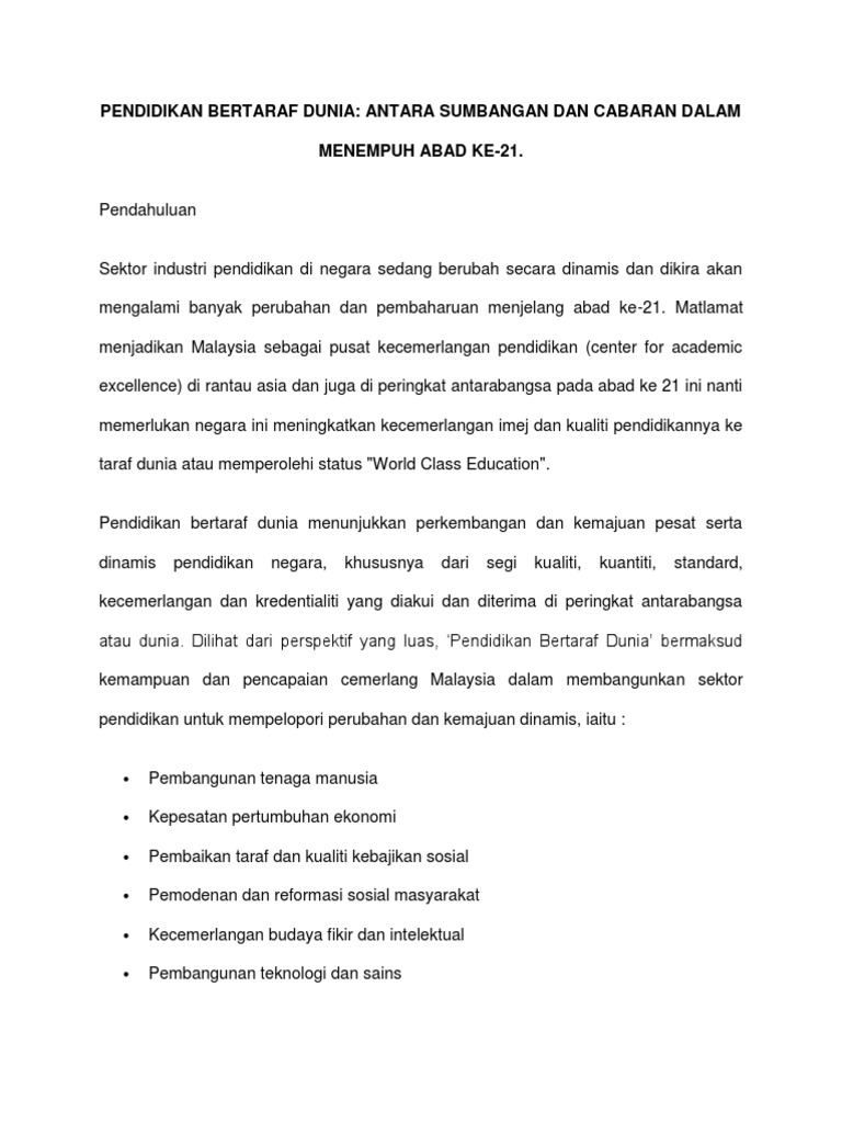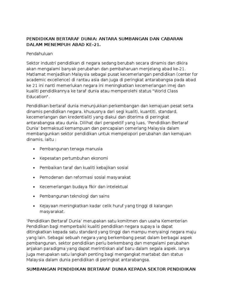 Menurut akhbar Utusan Malaysia bertajuk CabaranPerubahan Dasar 3 Pendidikan oleh Tan Sri Alimuddin MohdDom 4 menyatakan bahawa perkembangan bidang pendidikan merupakan antara faktor perkembangan pelbagai bidang terutamanya bidang politik ekonomi dan sosial pada abad ke 21 di seluruh dunia sama ada di negara maju mahupun negara yang sedang membangun seperti. Dalam Malaysia kearah menuju pendidikan bertaraf dunia kita tidak dapat lari daripada cabaran-cabaran yang boleh memberi kesan kepada dunia pendidikan. CABARAN KE ARAH MENUJU PENDIDIKAN BERTARAF DUNIA Dalam Malaysia kearah menuju pendidikan bertaraf dunia kita tidak dapat lari daripada cabaran-cabaran yang boleh memberi kesan kepada dunia pendidikan.